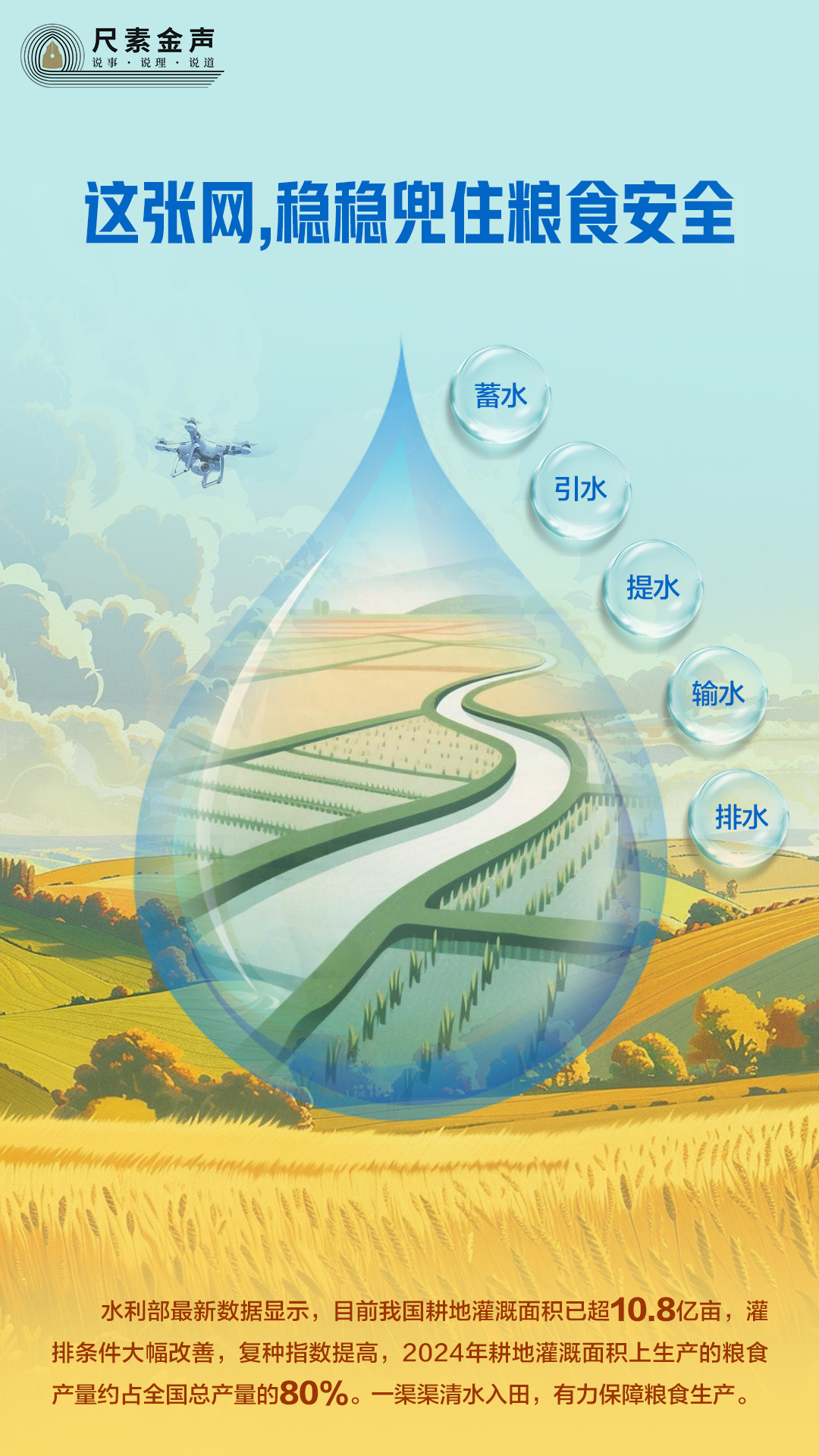有收無收全正在水。讓汩汩清水蓄得腳、引得出、流得暢,讓廣袤耕地“喝”上水、“喝”飽水、“喝”好水,端穩(wěn)端牢中國飯碗就有了愈加的根本。
